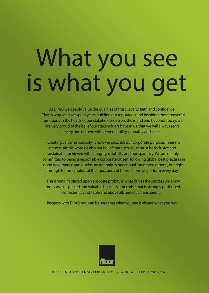 The core purpose of our organization is to fuel the dreams and aspirations of all stakeholders who partner with DIMO. The diversified nature of our business ensures we have sustainable returns and that we are highly resilient in the face of volatilities. Our governance structure is established in a manner that guarantees transparent processes and ethical business operations. We have comprehensive internal control systems, assurance processes and risk management processes to ensure that we secure the interest of those who invest in us.